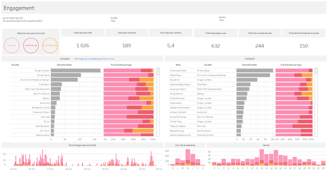 Ce tableau de bord présente des indicateurs pour mesurer l'engagement de tous les comptes ciblés dans les campagnes en cours. Il indique le niveau d'intérêt de chaque compte et contact en présentant les pages vues, les visites de site et les envois de formulaire.