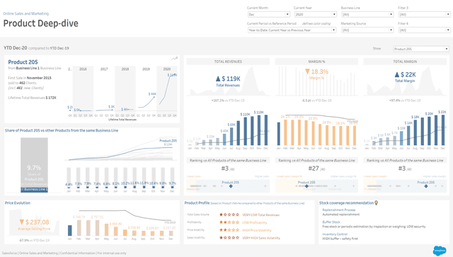 - 深入了解最低级别的详细信息: 客户、业务线、产品